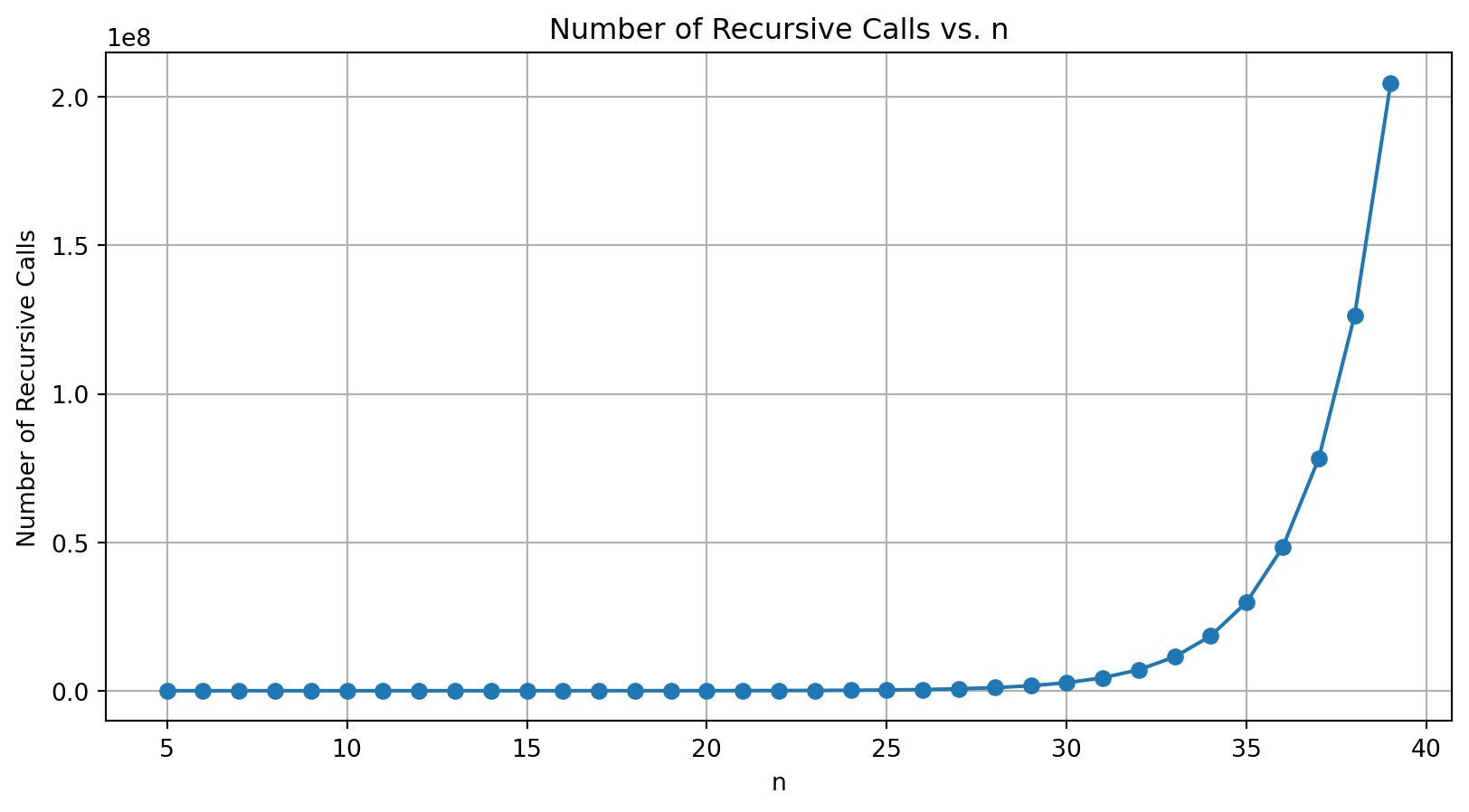 This recurrence relation closely resembles the Fibonacci series itself. The number of recursive calls made by the algorithm aligns with the Fibonacci numbers. Specifically, the number of calls grows as: \[ T(n) \approx F(n+1) \]