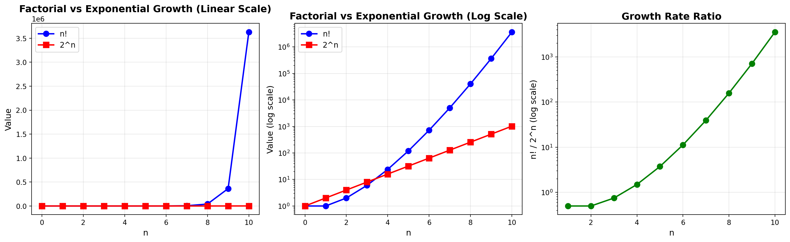 The built-in math.factorial() is implemented in C and optimized for performance. For production code, always use the built-in implementation. Manual implementations are valuable for understanding the underlying algorithm. Note that Python’s default recursion limit is approximately 1000, so recursive factorial will raise RecursionError for \(n > 1000\).